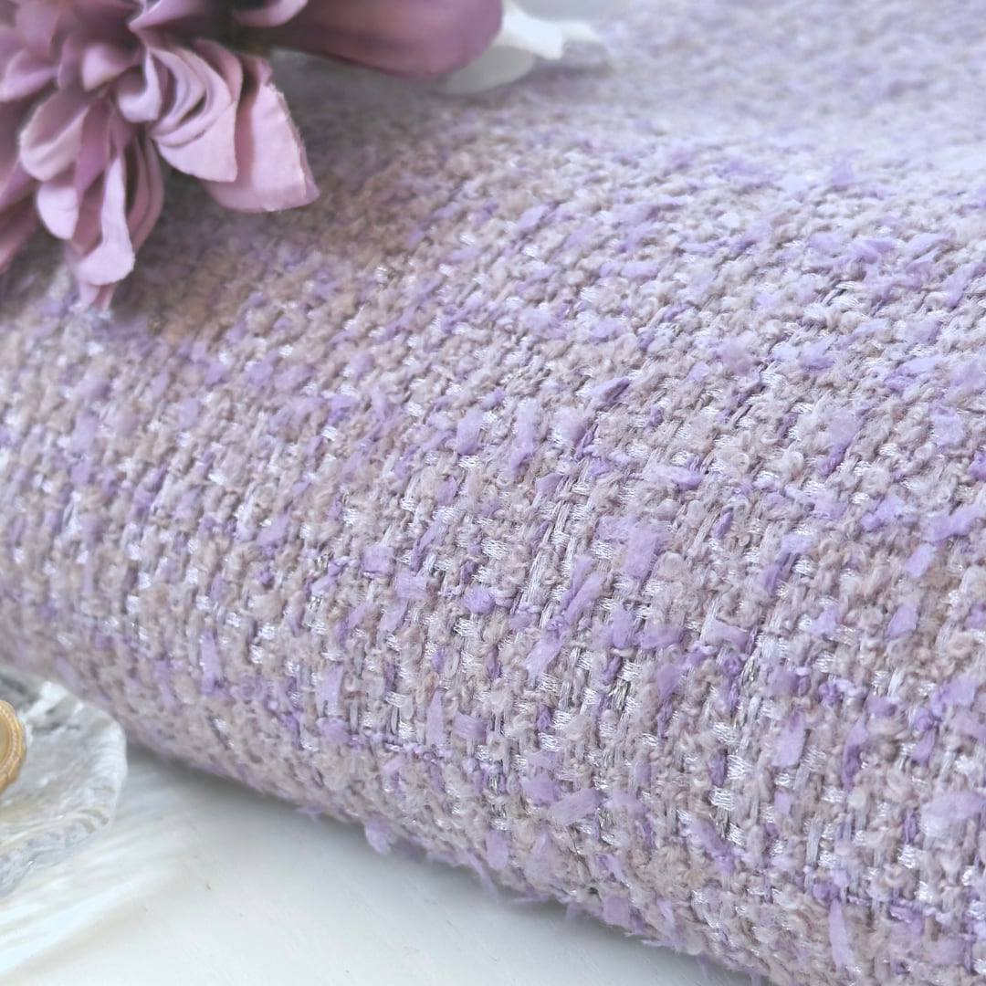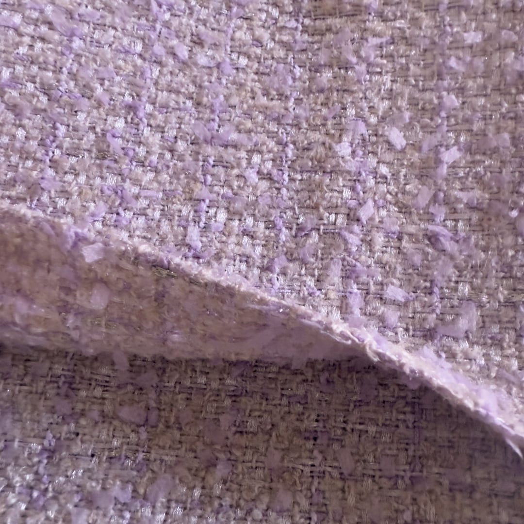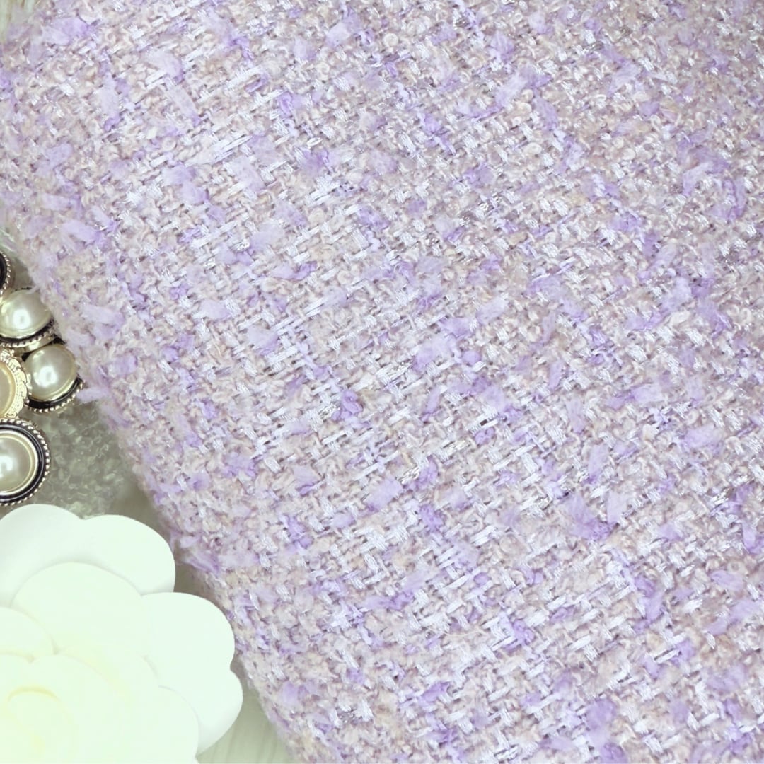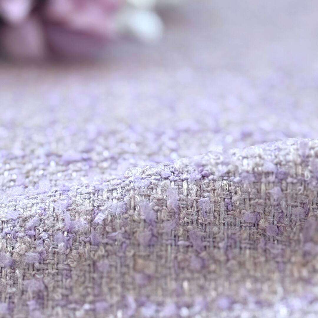 ミルキーなパープルにほんのりキラキラした糸が織り込まれ光の反射で更に光沢が増す生地となっております。時にはシルバーな輝きも放つ魅力的な生地です。