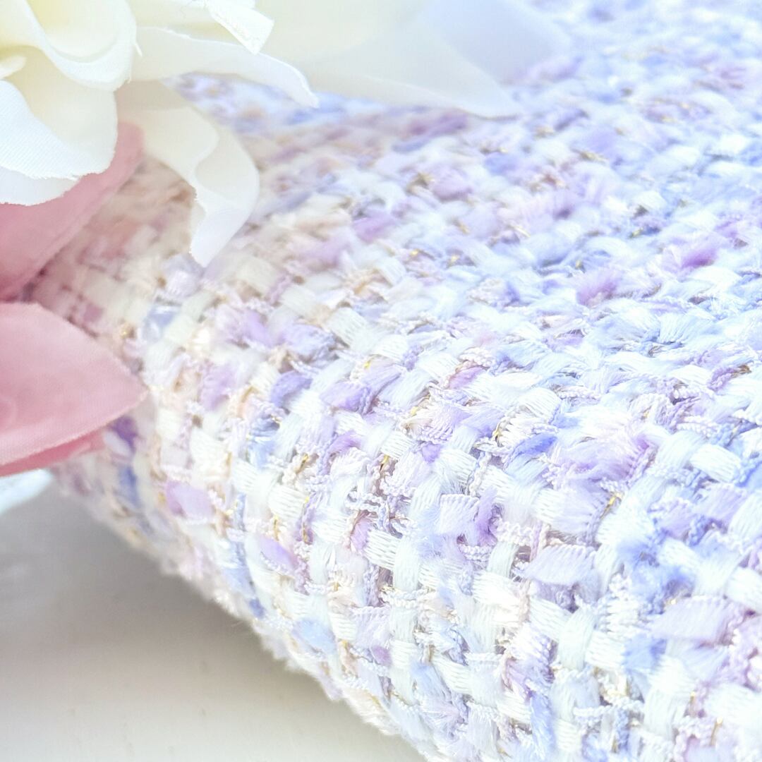パステルピンク・パステルパープル・パステルブルーの光沢リボンを贅沢に織り込んだ ファンシーツイード生地。