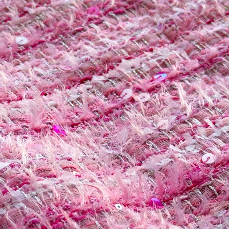スパンコールをあしらい、ピンクチュールにラメ、フェザーヤーン..と可愛らしさをぎゅっと詰め込んだファブリック生地。