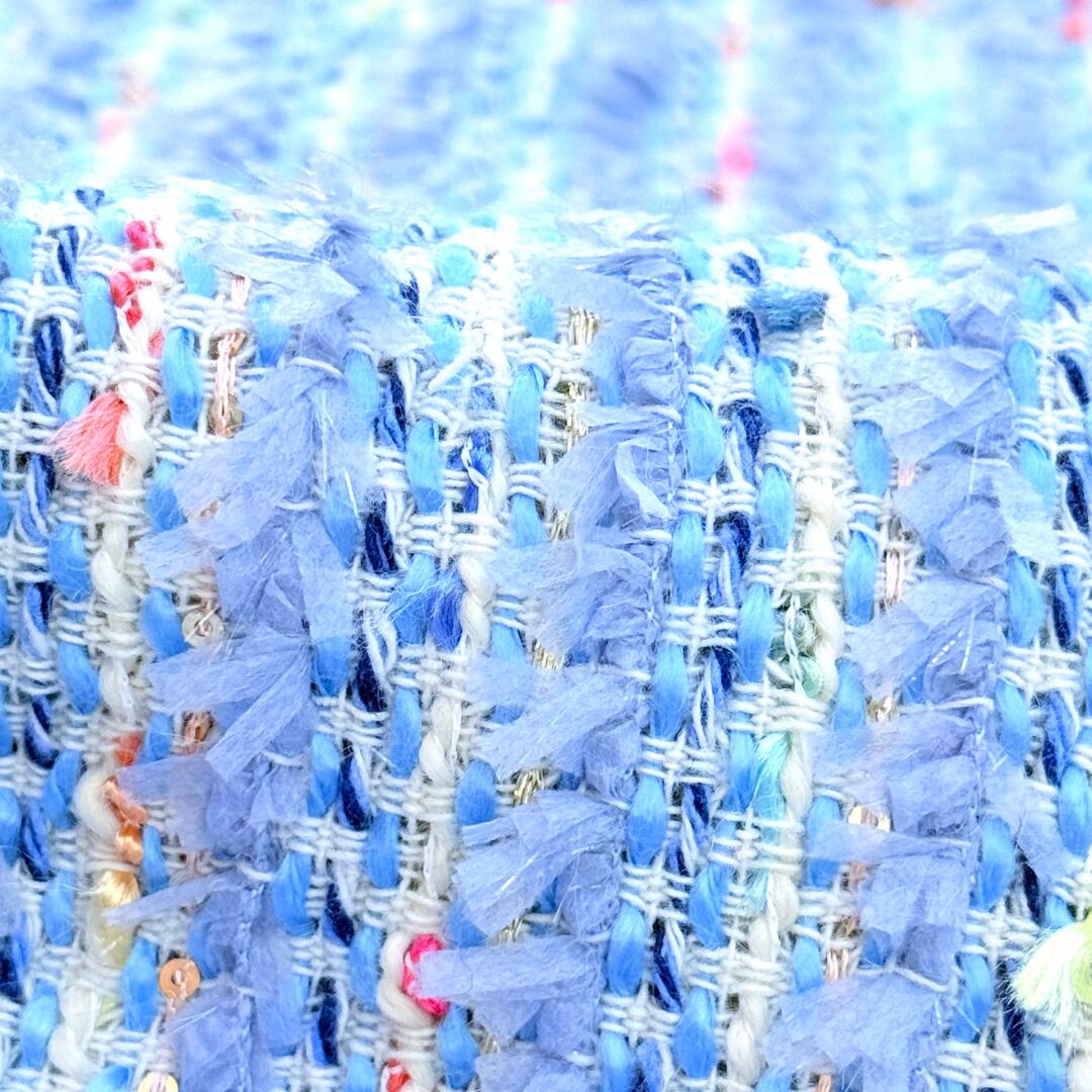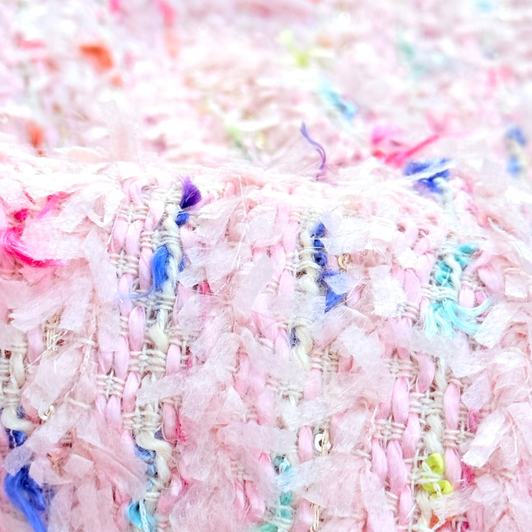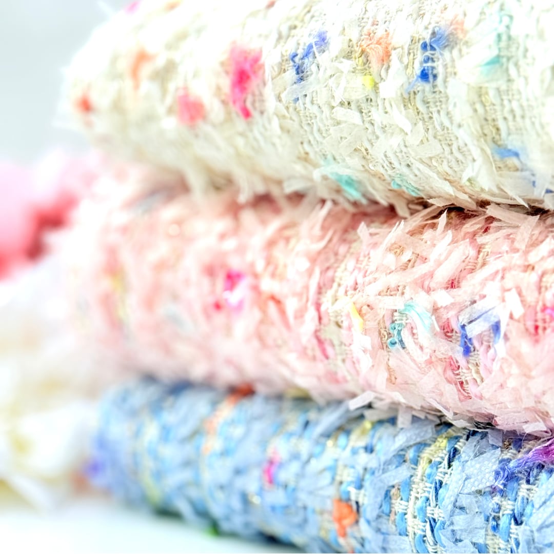 ホワイト、ピンク、ブルーの 3色展開のポップで華やかなツイード生地。