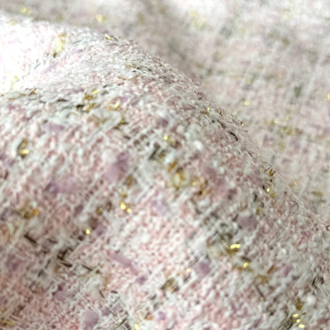 淡いピンクとホワイトを基調に、パープルのリボンヤーンがアクセントになった、とってもラブリーなツイード生地です♡