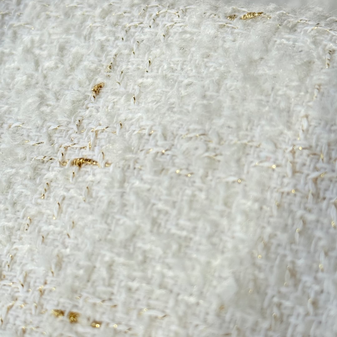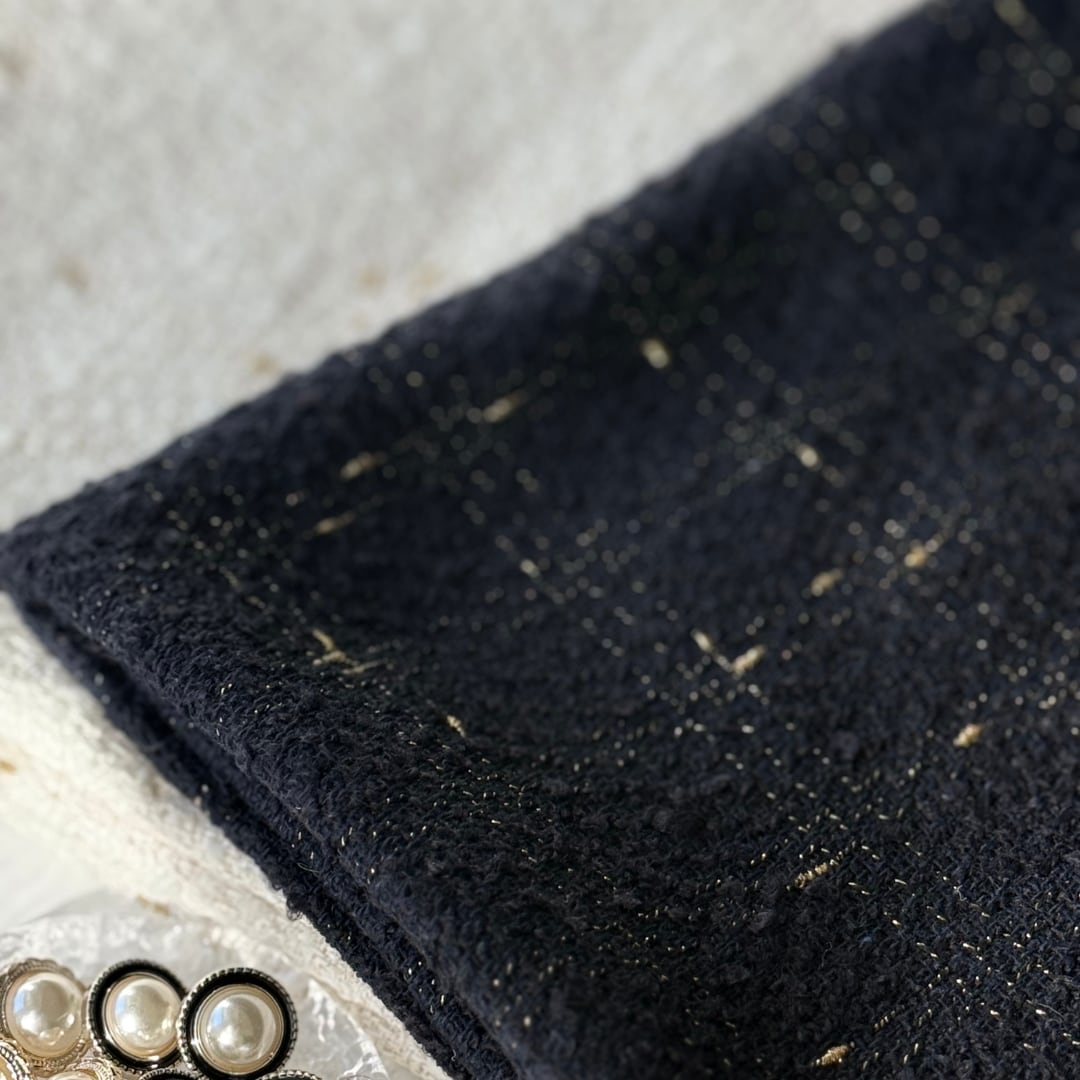 ネイビーとホワイトを基調に、ゴールド糸でチェック模様を織り上げた上品なツイード生地です。