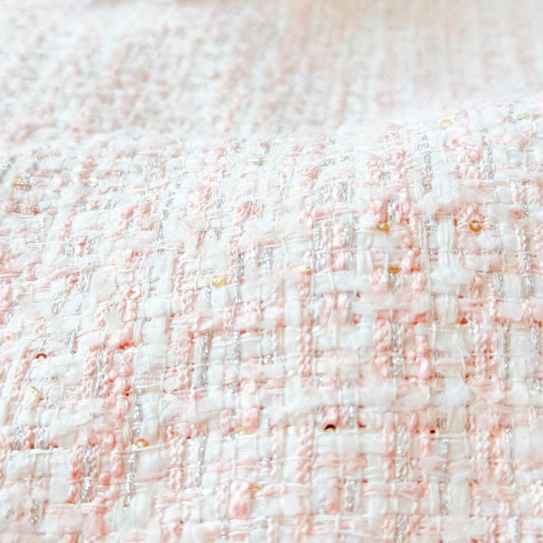 やわらかなベビーピンクの生地に、淡くきらめく小さなスパンコールを散りばめ、控えめでありながら確かな存在感を放ちます。
