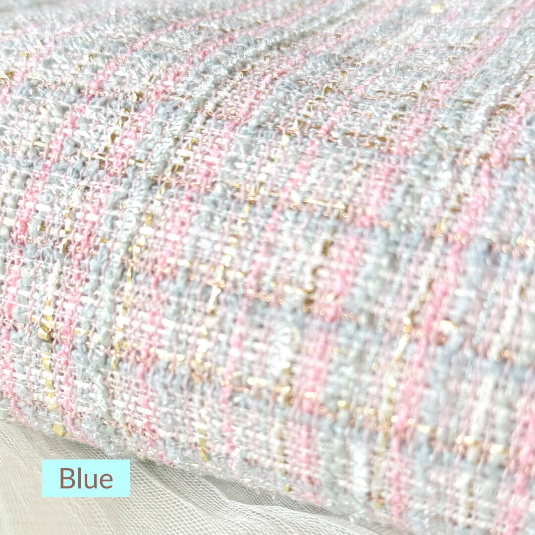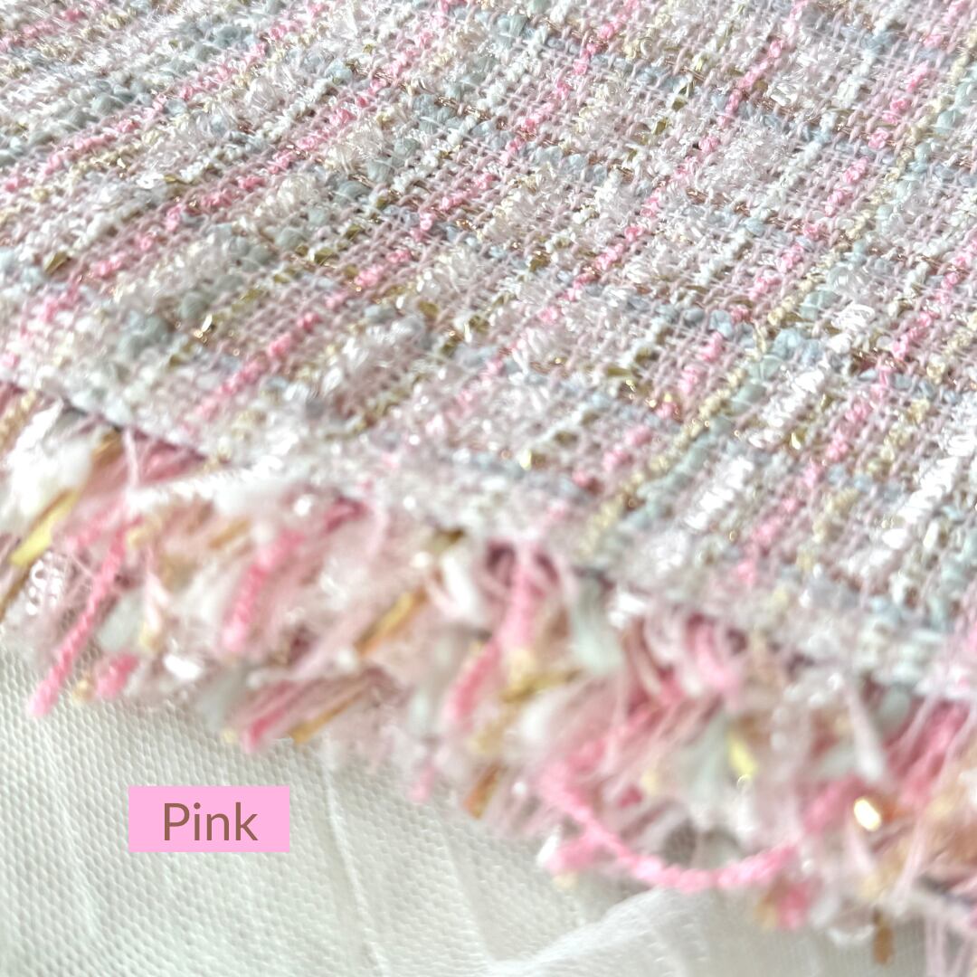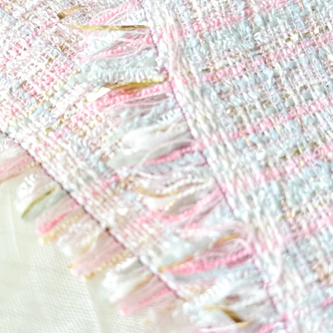 柔らかなピンクを基調に、ミントブルーとゴールドの糸が絶妙に重なりあい、光を受けるたびに上品な輝きを放ちます。(ピンク)